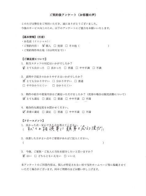 ご契約・お引渡しまで無事にお手続きが完了できましたこと、大変うれしく思っております。今後も何かお困りのことやご相談などがございましたら、いつでもお気軽にご連絡ください。